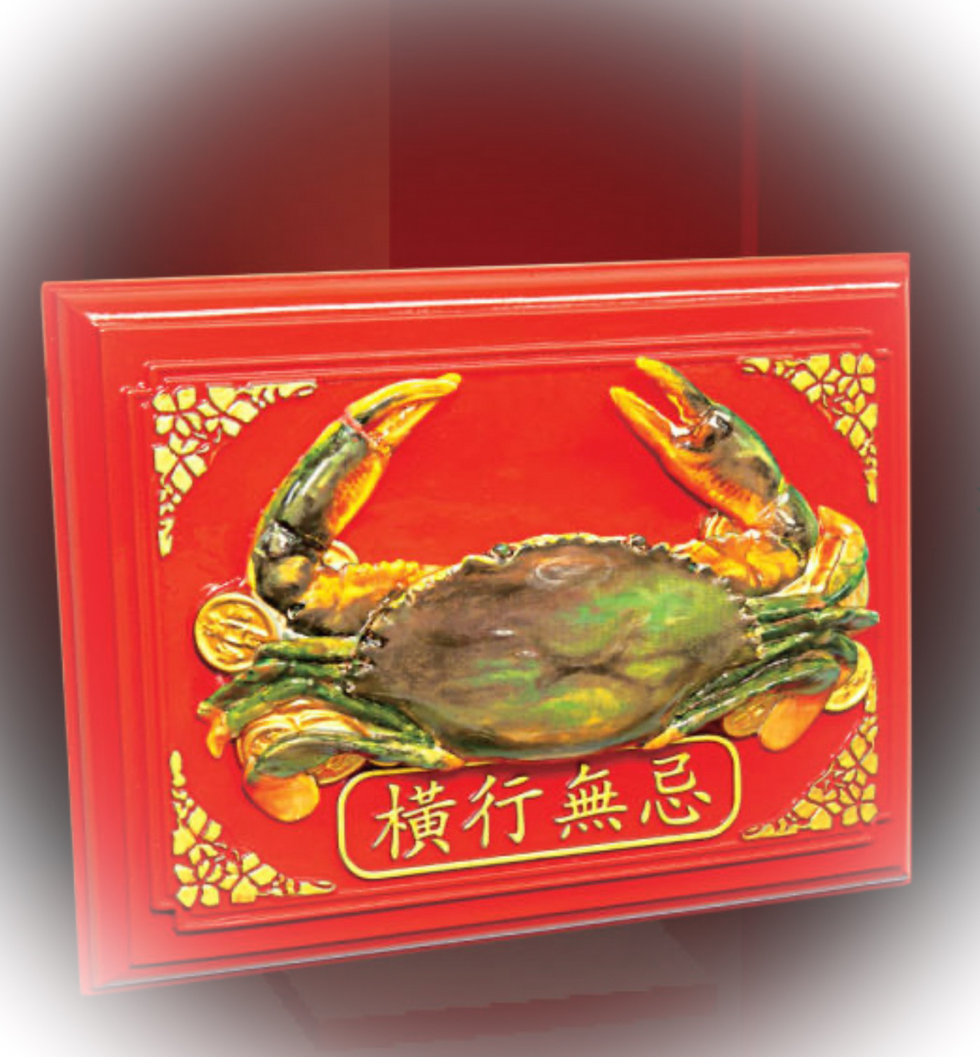 「橫行無忌」牌是一隻青色的蟹將軍,鑲嵌於紅色牌匾上,生氣勃勃,寓意鴻運當頭。蟹為青色,是有意設計,寓意生猛有活力。蟹也是所有女性旺夫運之最佳風水物。