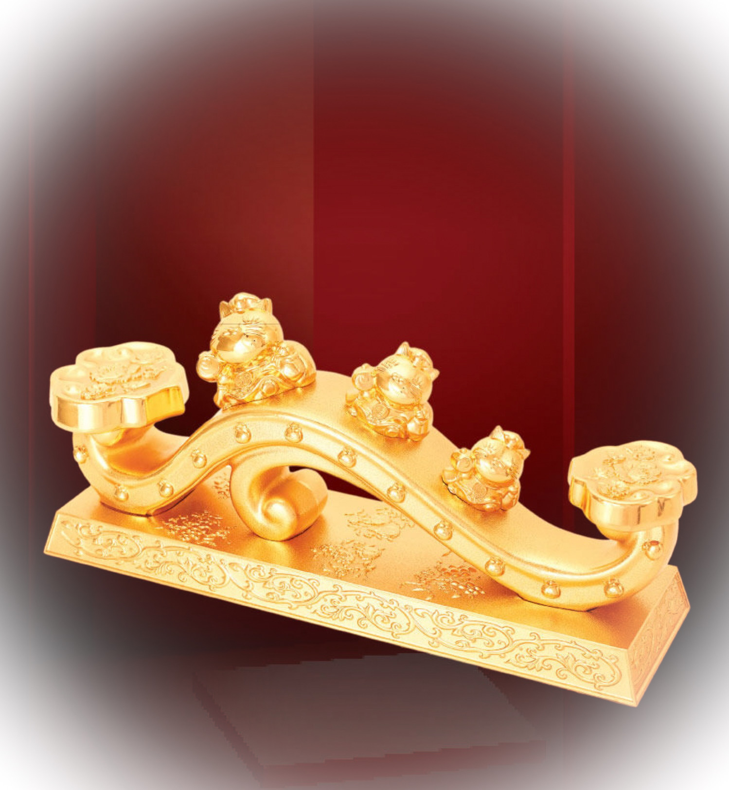 如意頭又像祥雲,見祥雲必屬吉兆,如意的靈芝頭,代表珍貴且可化一切疾厄,寓意可消災化險。因此,「如意」是十分吉利之吉祥物。「如意」上有一大兩小招財貓,貓是寅木,被譽為現代版的「天祿」。