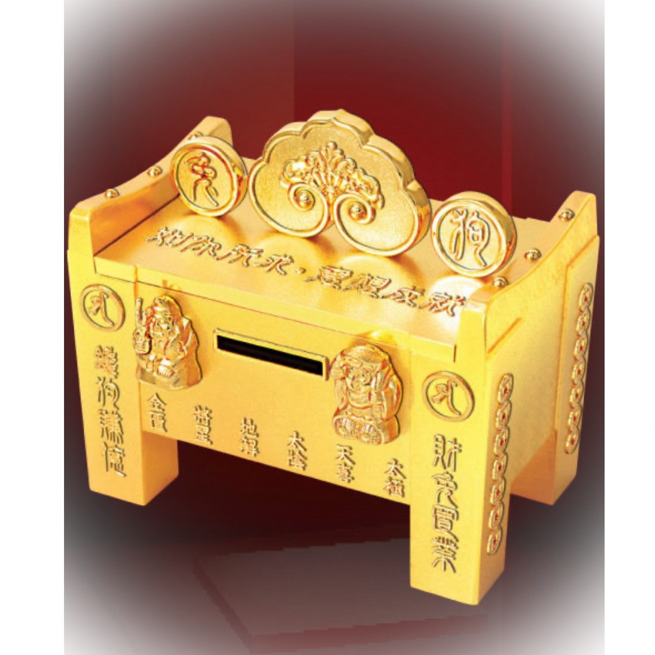 今年的大財箱是古財鼎造型。在下元八運中,鼎通常是三腳,但是現在要「四腳」了!原因是今年已進入九運鼎卦第五爻「執鼎耳」,代表要執起兩隻鼎耳,把鼎進行搬動,造成目今的世運都不穩定。所以我們就要用 「四腳鼎」來做我們的六合財箱,四平八穩,保住運勢和財運都穩如泰山 。內有「富貴天子虚空藏」菩薩梵文種子字加持人人開啟智慧,福智雙全。