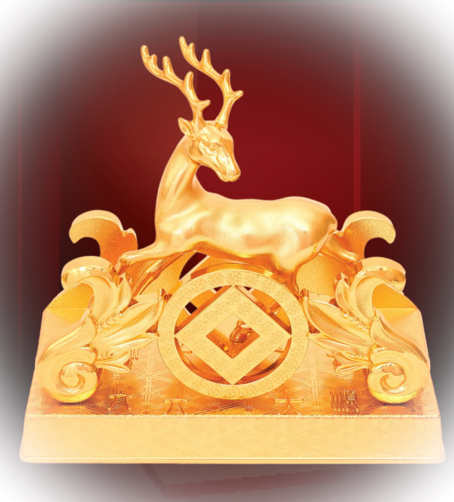 「鹿王鎮」的千歲鹿是在站在一輛鹿車上,由兩個大菜頭和兩個大銅錢組成。大銅錢除了代表財之外,圓形的銅錢是化五黃煞最重要的圖騰。又形如大金剛輪,上面刻滿金色八輻輪,寓意轉動法輪,破除一切障阻。大菜頭寓意彩頭,代表招大財也。